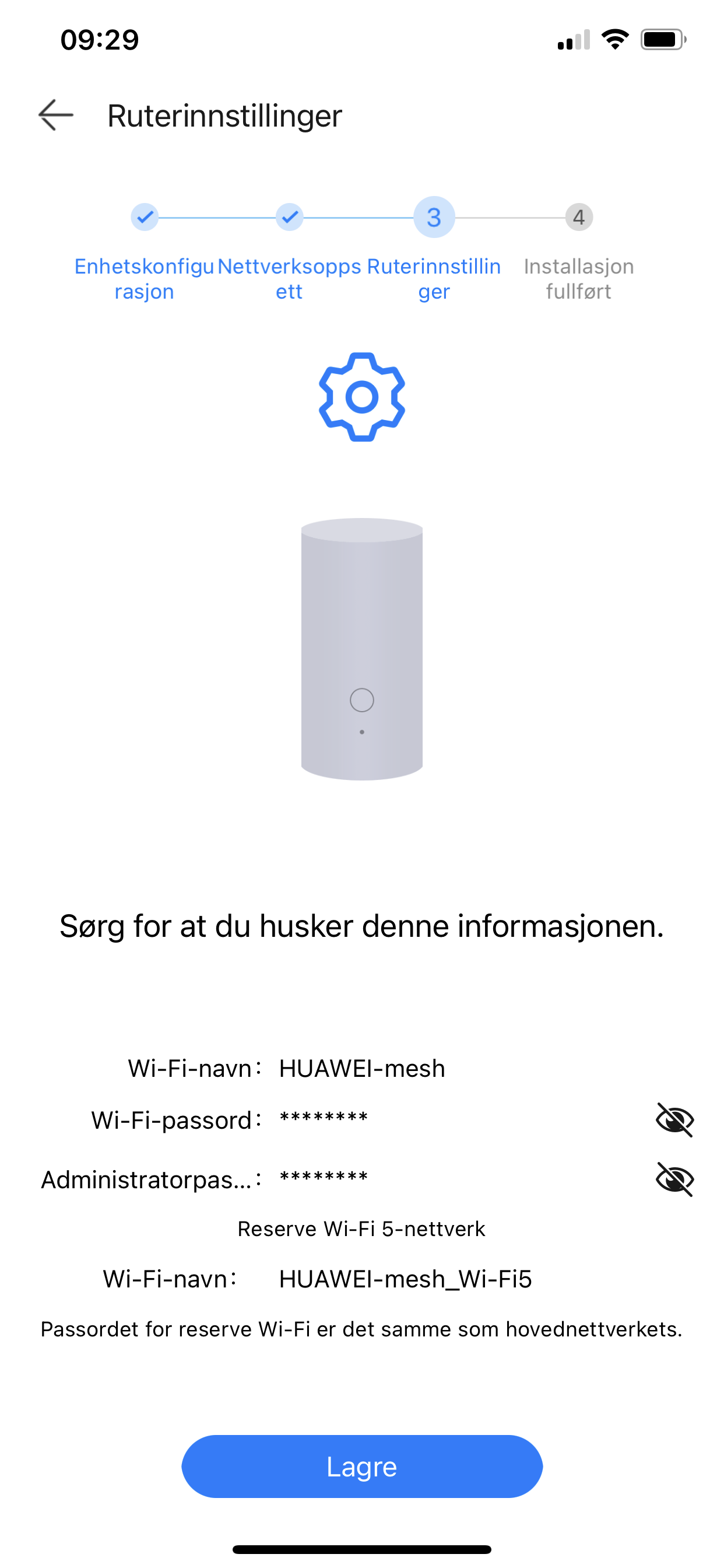 Download Huawei Life-app’en på din mobil, log ind på et midlertidigt netværk, der deles af routeren, og følg instruktionerne i app’en. Routerens LED lyser konstant blåt, når den er forbundet til internettet.