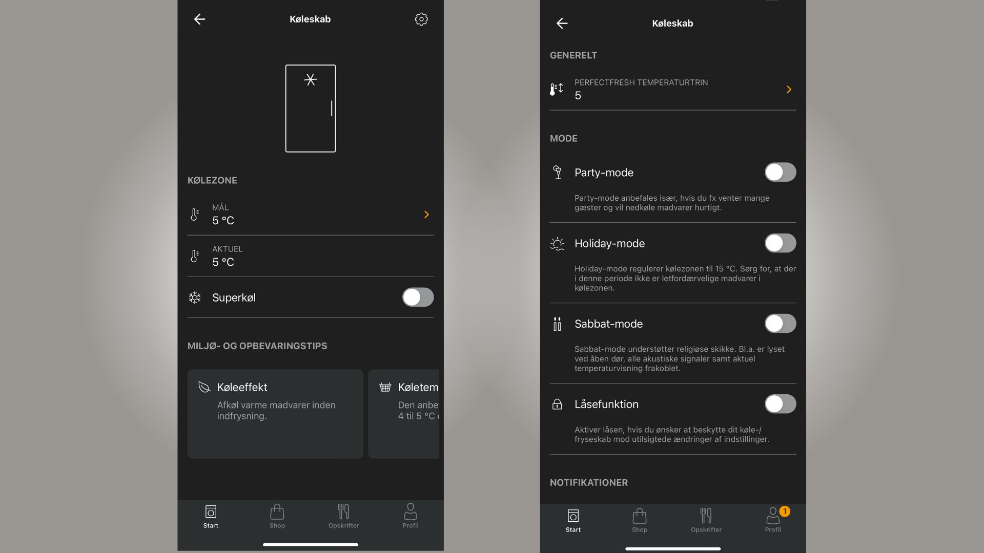 Med app’en kan køleskabet fjernstyres, og der kommer en notifikation, hvis døren står åben. (Screendump: Miele app)