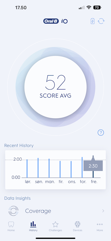 I den periode, jeg har brugt Oral-B iO10, er jeg ifølge app’en begyndt at bruge længere tid på tandbørstningen. Det er slut med at sjuske. Jeg får rengjort hver en krinkelkrog af gebisset, men jeg må vænne mig af med at trykke så hårdt med tandbørsten. Det har jeg ellers altid gjort, men det er måske derfor mine gummer ikke kan lide mig.