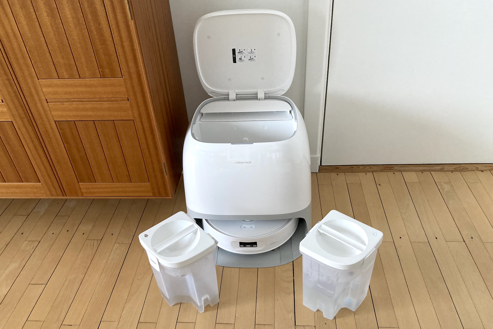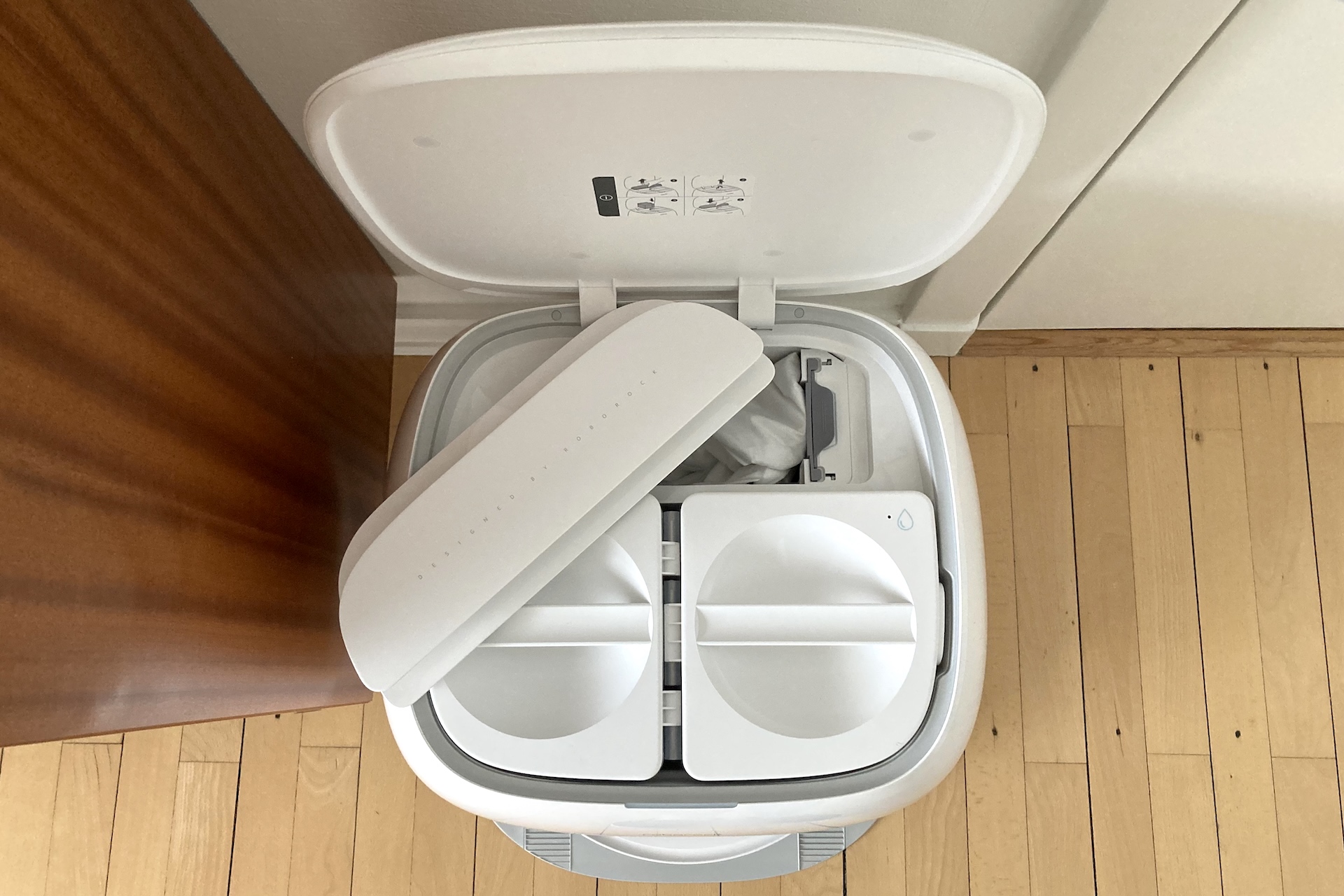 Under basens buede låg sidder tanke til rent og brugt vand samt en støvpose. Designet kræver frigang til at åbne låget og løfte eller sænke tankene ned på plads eller skifte pose.