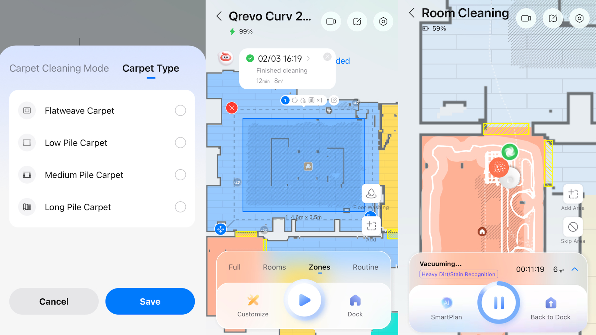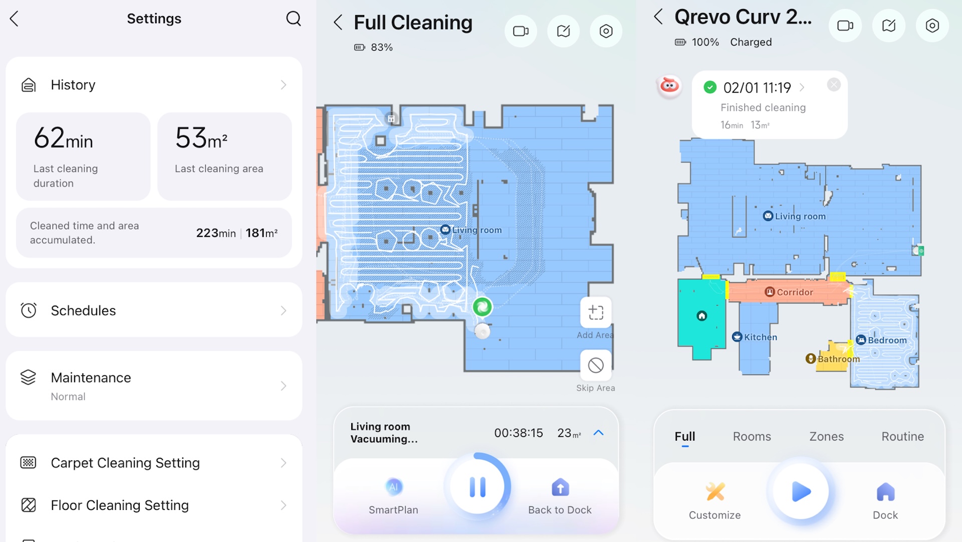 App’en har de velkendte menuer og mulighederne på startskærmen i form af Full, Rooms, Zones og Routine. Det vil sige gulvrengøring af hele boligen, enkelte rum, i udvalgte zoner eller som rutiner. For eksempel hver dag i spisestuen efter morgenmaden.