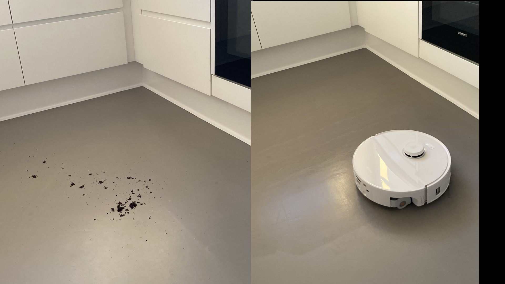 Trods pibelyd er resultatet af moppens arbejde fremragende. Vådt kaffegrums strøet ud på køkkengulvet og ekstra skidt i et stoftæppe blev automatisk registreret og fjernet. Intet opsamlet kaffegrums blev smidt ved dørtrin på vej hjem til basen.