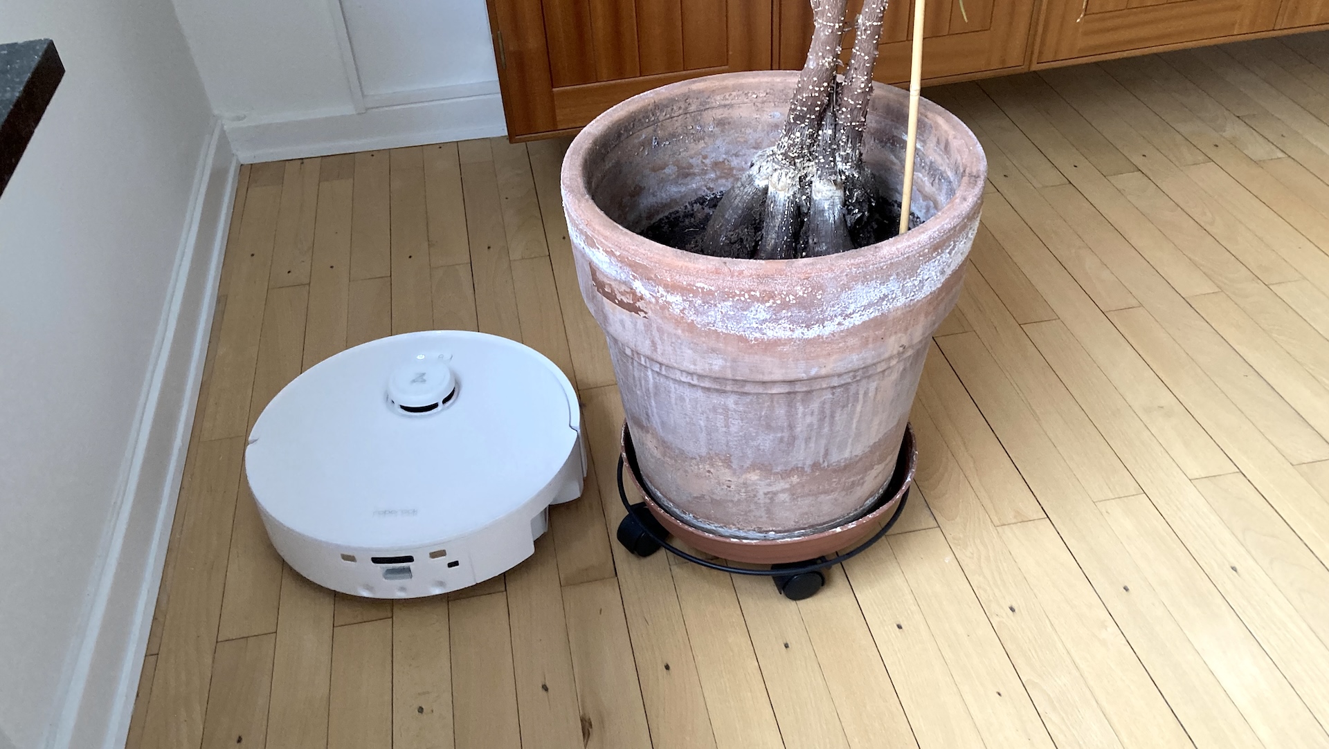 Hjemmets mest besværlige dørtrin er cirka 2,5 centimeter højt. Den ene side har en 3,5 centimeter lang, skrå ”rampe” i en vinkel på 44 grader. Målene viste sig uoverstigelige for Qrevo Curv 2 Flow. Efter et tryk på lågets pauseknap, løftede jeg robotten over trinet og genaktiverede den.