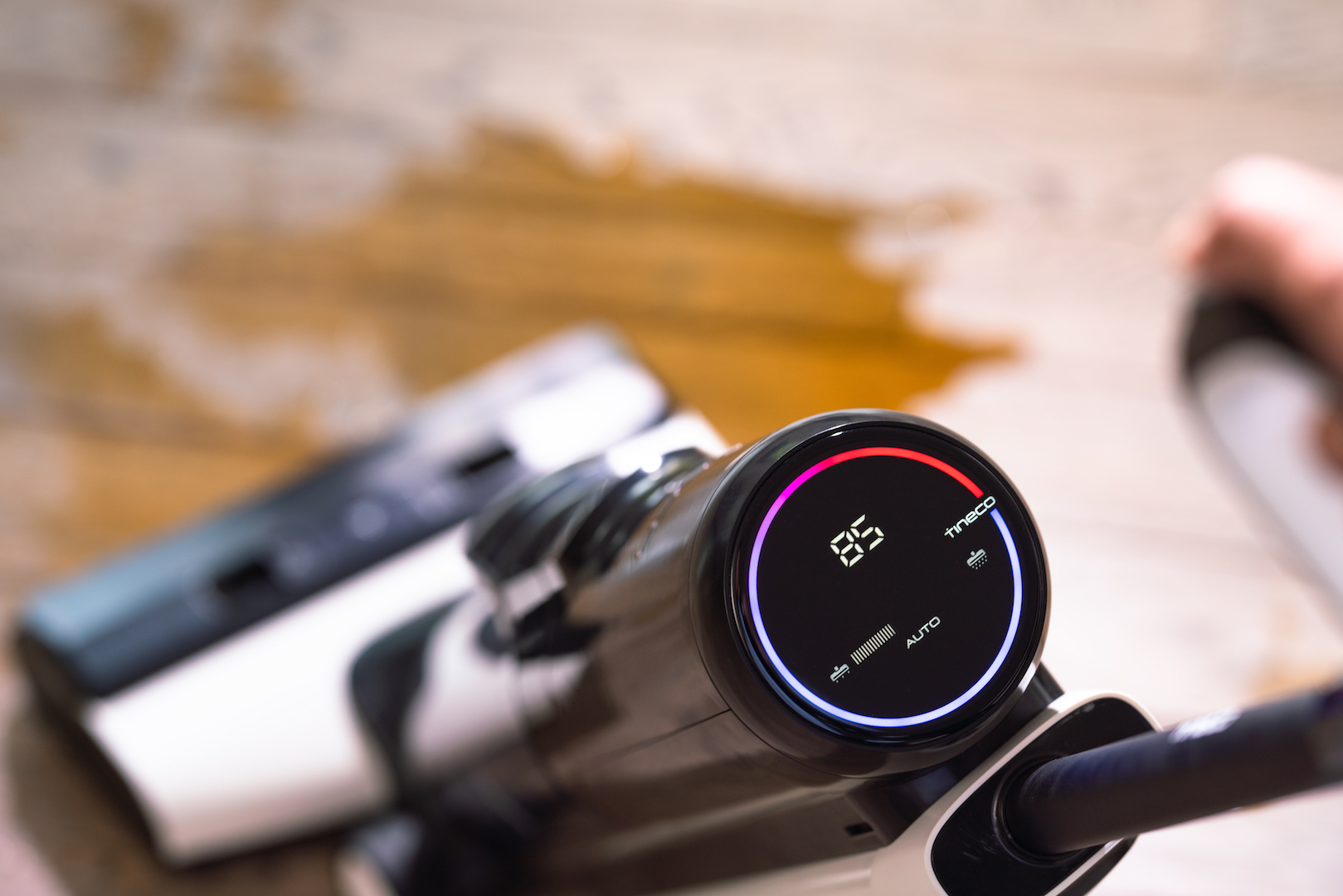 Den blå ring skifter til rød, når Tineco Floor S5 Extreme sætter turbo på rengøringen med at opsuge væske. (Foto: Tineco)