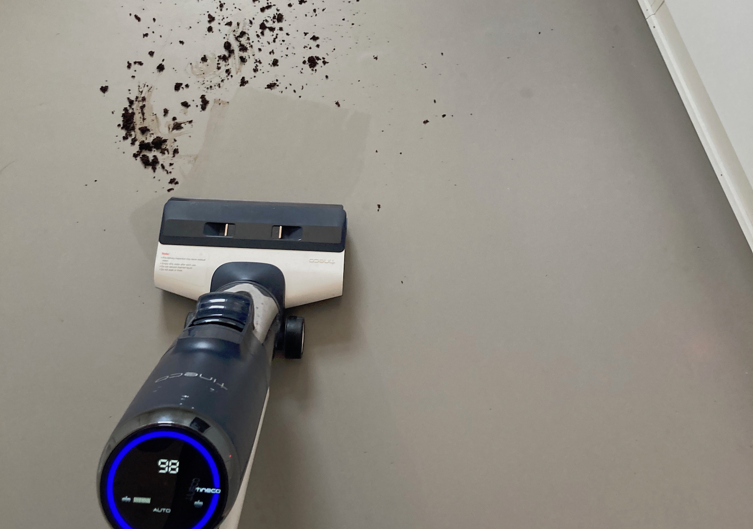 Vand og sæbe tilsættes, samtidig med at Tineco suger kaffegrums til sig. Effekten er fortrinlig. (Foto: Natasja Broström)