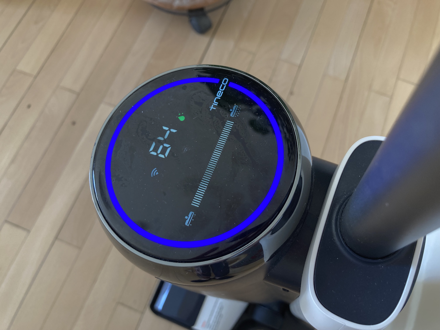 Det grønne dråbeikon viser, at Tineco Floor S5 Extreme er i gang med en selvrengørings-cyklus. Typisk varer det fem minutter. (Foto: Natasja Broström)