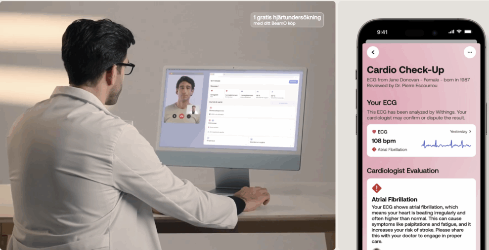 Efterhånden kommer det frem, at Withings vil have, at man abonnerer på en tjeneste kaldet Withings+, hvor en kardiolog kan analysere ens EKG-data. Der står også, at man med »et enkelt klik kan dele sin optagelse«, vi formoder med en læge. Beskrivelsen fortsætter med, at »din læge ser dine data i realtid via HealthLink-brugerfladen«. Men læser man det med småt, vil man se, at tjenesten kun er tilgængelig i Frankrig, Tyskland og USA. Der står også, at de tester »AI-drevne personaliserede indsigter og korrelationer«. Om dette analyserer hjertelyde eller ej, nævnes ikke.