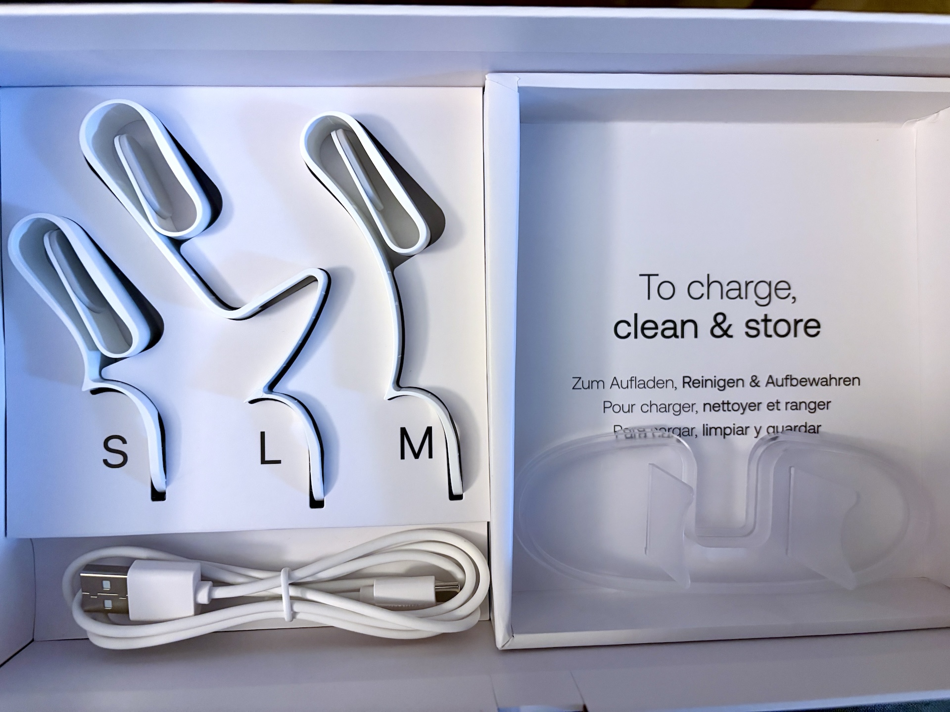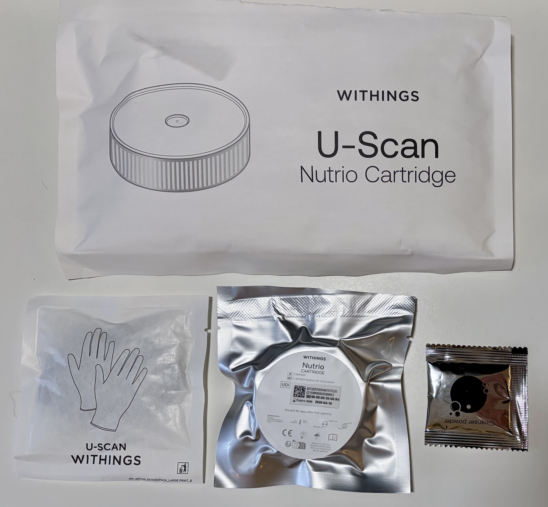 Ud over måleapparatet indeholder æsken en opladestation med et USB-kabel, men ingen oplader; du skal bruge en eksisterende mobiloplader. Den indeholder også clips i tre størrelser, der bruges til at fastgøre apparatet på indersiden af toiletkummen. Hvilken du har brug for, afhænger af toilettets design, som varierer fra land til land. Der var ingen problemer med den skandinaviske type. Vi modtog også en pose med en patron og latexhandsker for hygiejnisk håndtering.