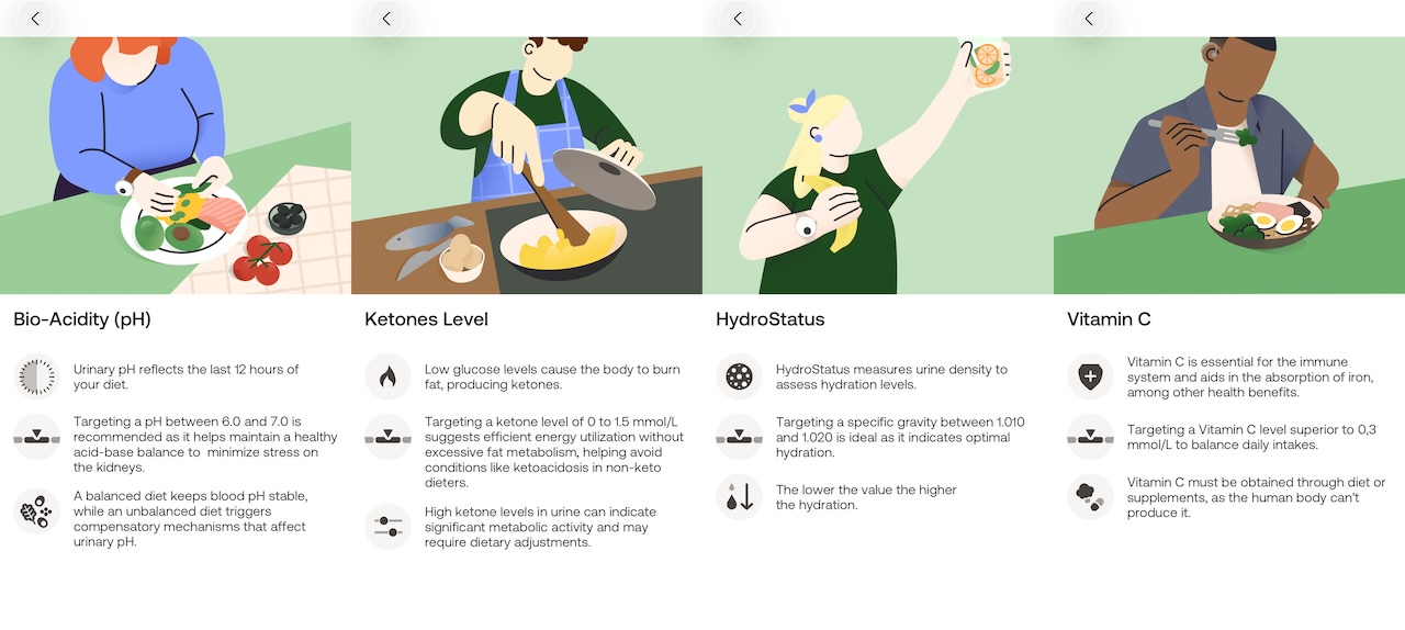 Et godt stykke tid efter du har “indsendt” prøven, bipper app’en, og du får dine resultater. I mit tilfælde var pH-værdien inden for det normale interval, omend i den lave ende. En lav værdi betyder, at du bør gennemgå din livsstil og vaner. Mit C-vitamin niveau var optimalt, så vitamintabletten om morgenen er tilsyneladende gavnlig, da jeg ikke spiser mange citrusfrugter. Keton-målingen er normal, så mit indtag og forbrænding af kulhydrater er afbalanceret. En høj værdi kan være et tegn på diabetes eller for den sags skyld en keto-diæt. App’en mente dog, at jeg var lidt dehydreret og burde drikke mere vand.