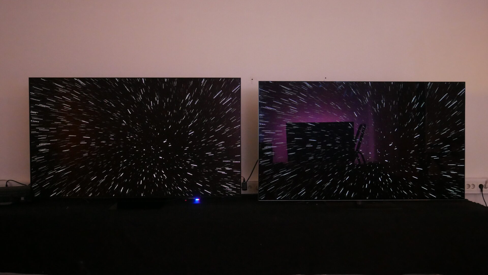På den anden side var der mange andre tilfælde, hvor Samsung-skærmen så mærkbart renere og skarpere ud takket være den matte finish. Og når lyset dæmpes eller slukkes, er der kun lille forskel på sortniveauet. Og her vil Samsung-skærmen i mange tilfælde have en betydelig fordel, især hvis du har lamper eller vinduer direkte bag din sofa. Så her må man simpelthen prioritere lidt ud fra sine egne præferencer og lysforholdene i hjemmet.
