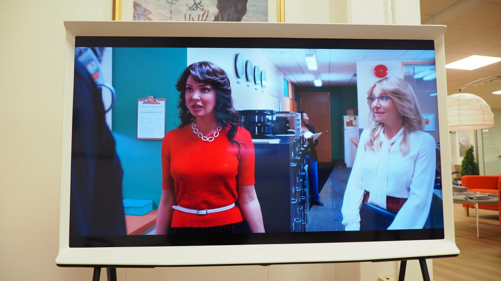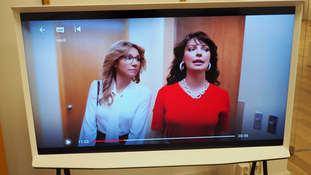 Når man sidder lige foran TV-skærmen, ser billedet dog fremragende ud. Og her bliver en af fordelene ved The Serif klar: Det er nemlig let at flytte rundt på og kan fint placeres i et hjørne, hvor det vinkles mod sofakrogen. På den måde er det let at finde en optimal betragtningsvinkel der, hvor man sidder.