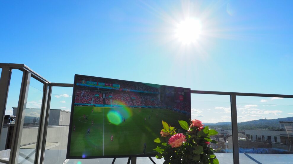 Hele pointen med The Terrace er at se fjernsyn udendørs, så derfor har vi også testet det i det fri, på undertegnedes tagterrasse. Testen faldt sammen med starten på EM i fodbold, hvilket jo var praktisk.